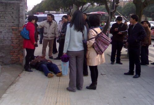 老人趴在人行道上,紧闭着双眼,嘴角往外流着血,双手似乎还微微颤抖着。“还活着吧”,有人这样说道。